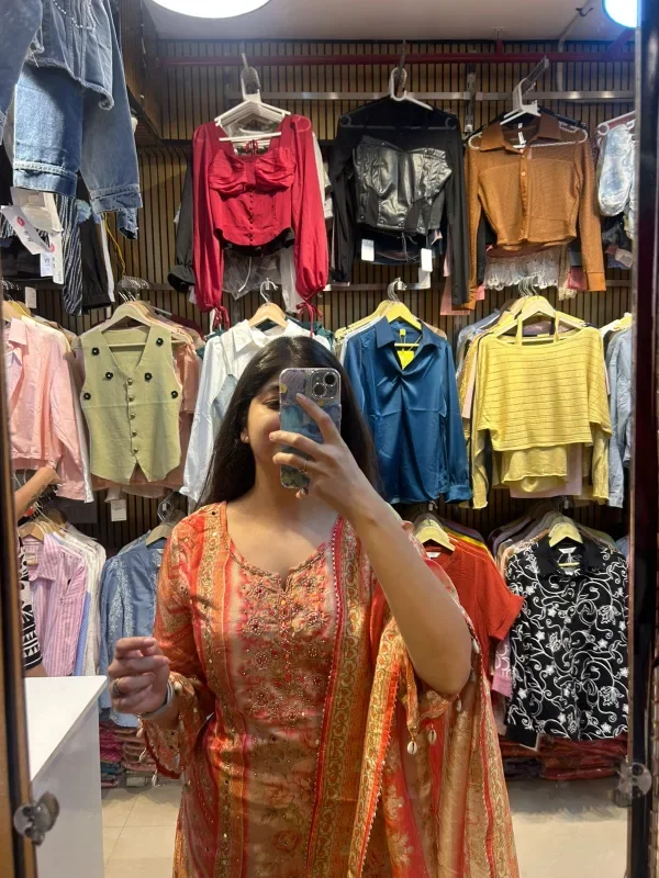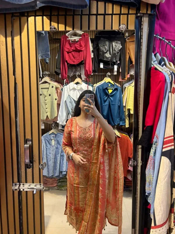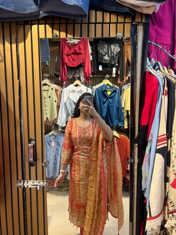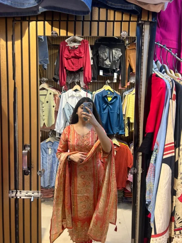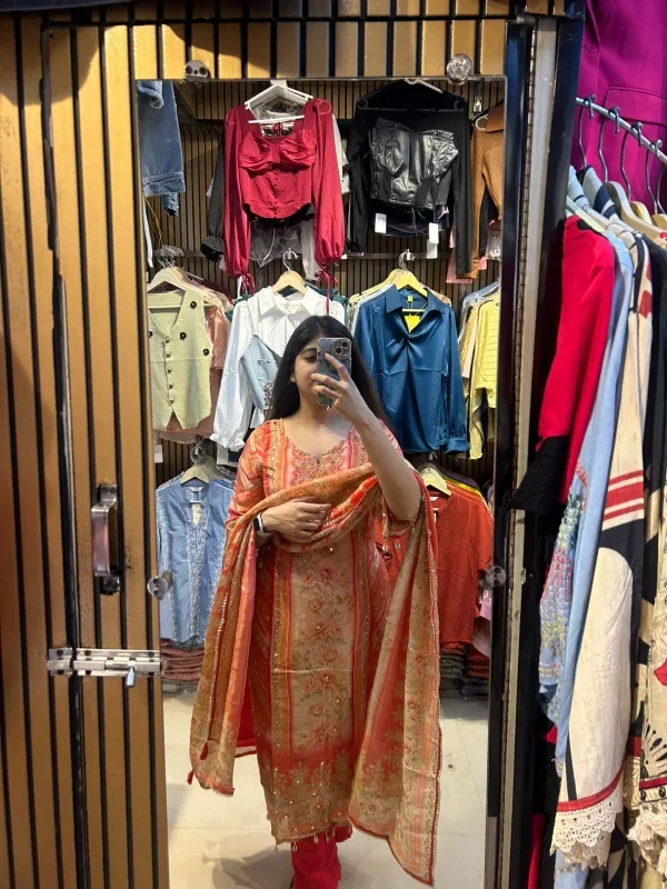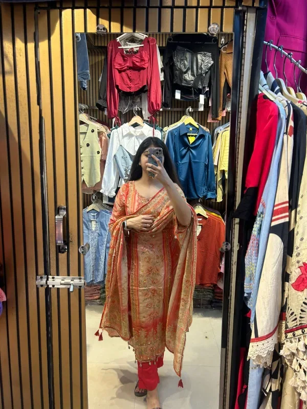The vibrant and intricate design of this traditional attire, captured in the mirror reflection, brings together both elegance and grace. The delicate threadwork and embellishments on the outfit’s fabric reflect a timeless fashion. With a beautiful orange and gold color combination, the ensemble exudes a regal charm, while the light pink dupatta with its dangling tassels adds a soft touch. Paired with matching trousers, the look embodies a blend of cultural richness and modern flair. The backdrop with casual fashion items contrasts nicely with the traditional charm of this outfit, creating a unique fashion statement. Perfect for festivals or family gatherings, this look is both classic and contemporary, making it an ideal choice for those seeking something stylish yet traditional.